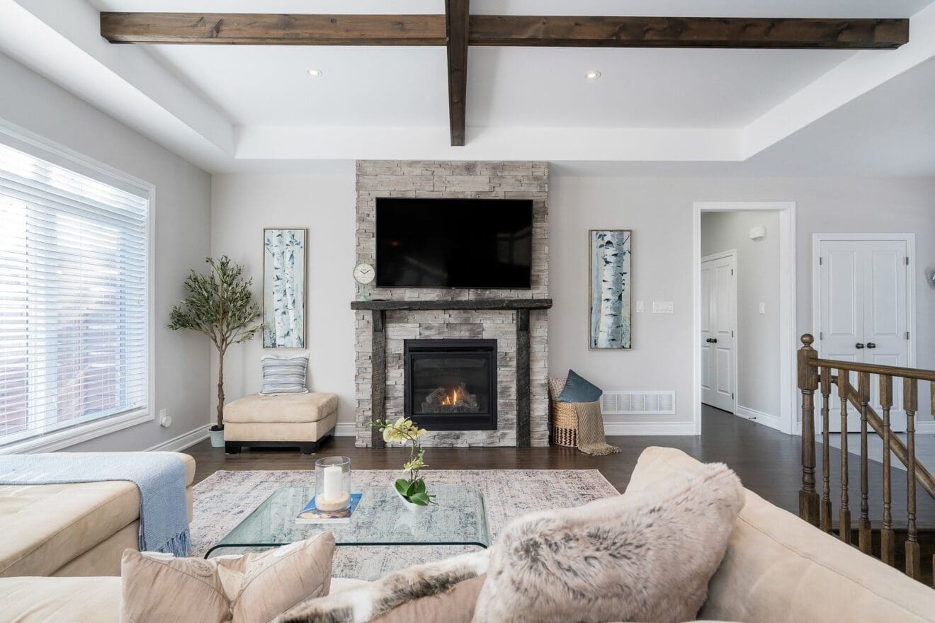 Elmvale is known for its small town charm, where roots run deep and families tend to stay for generations. This solid, quality built bungalow is situated on an extra-wide almost 60′ pie shaped lot boasting the Tuscany model a much preferred layout with 2545 sf of superb living space inclusive of the lower level. 10′ ceilings on the main floor with striking wooden beams & a gorgeous gas fireplace with floor to ceiling stone surround.